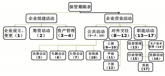 一般来说,企业营业管理活动不外乎经营管理、生产技术管理、行政管理和党群工作四个方面,但为了表达方便,把四个方面活动的共有部分抽取出来进行集中表述,即公共活动和对外交往两个方面。公共活动主要是会议,会议又分为决策会议、专题会议、大型会议三类,分别对应《企业管理类正规det365登录网站_beat365倍率_365官方入口-app下载保管期限表》中序号5—7三类正规det365登录网站_beat365倍率_365官方入口-app下载。而对外交往活动又分为与上级的交往、与平级无隶属关系组织、个人的交往和与下级的交往三个方面,分别对应《企业管理类正规det365登录网站_beat365倍率_365官方入口-app下载保管期限表》序号8—11四类正规det365登录网站_beat365倍率_365官方入口-app下载。职能活动包括经营管理、生产技术管理、行政管理和党群工作四个方面,分别对应于《企业管理类正规det365登录网站_beat365倍率_365官方入口-app下载保管期限表》序号13—16四类正规det365登录网站_beat365倍率_365官方入口-app下载,17是冗余项,将无法划入具体职能活动的正规det365登录网站_beat365倍率_365官方入口-app下载入此。具体见下图。