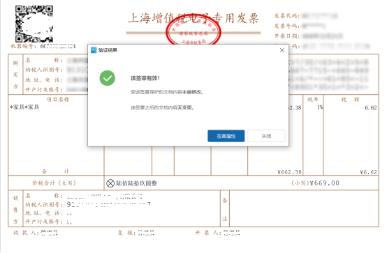 如验证结果为“该签章有效!受该签章保护的文档内容未被修改。该签章之后的文档内容无变更”,表明销售方的电子签名有效。