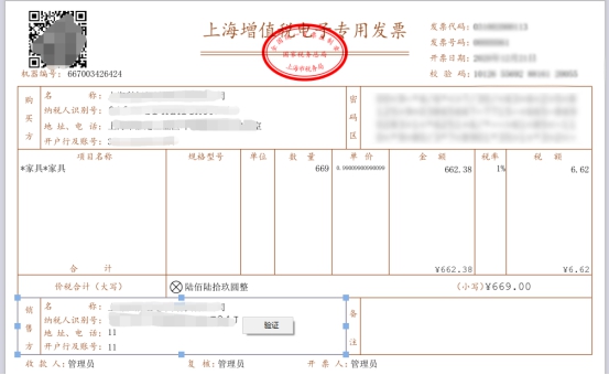 验证电子发票监制章具体方法如下:通过增值税电子发票版式文件阅读器打开已下载的电子专票版式文件,鼠标右键点击发票上方椭圆形的发票监制章,选择“验证”,即可显示验证结果。